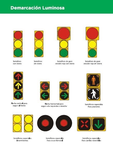 - Señales con luz propia, continua o intermitente, destinada al usuario de la vía pública, que tienen por finalidad transmitir órdenes o prohibiciones que modifican las reglas generales para el caso, advertir determinadas circunstancias, encauzar y regular la circulación, mediante la utilización de colores, flechas o figuras especificas con ubicación y formas predeterminadas.